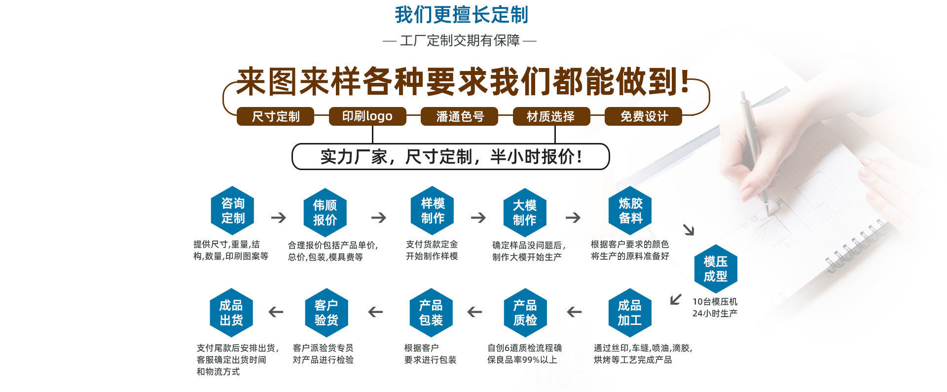 东莞91免费片版下载是一家自营生产、设计、研发、销售为一体的民营东莞硅胶制品厂家,自有3000平米的生产基地,员工一百多人,月产硅胶制品20万件,硅胶厨具生产厂家拥有完整的设备设施,20台硅胶平板硫化机设备,硅胶套量产能力强大,质量保证。