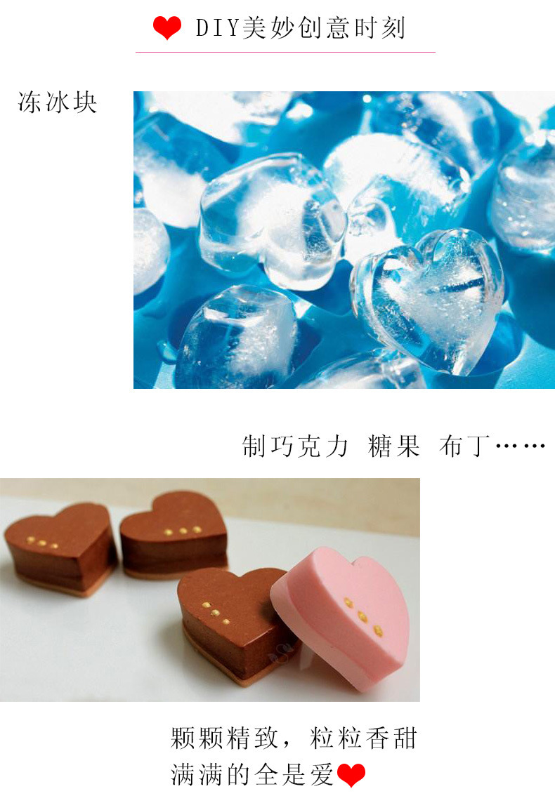 ●爱心冰格适合产品:冰块布丁、饼干蛋糕、慕司果冻、调理食品、巧克力等均可使用。
