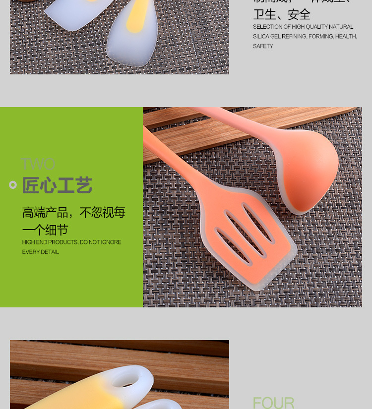 这套硅胶厨具完美的适用于家庭厨房,安全环保耐用,很好的保护了