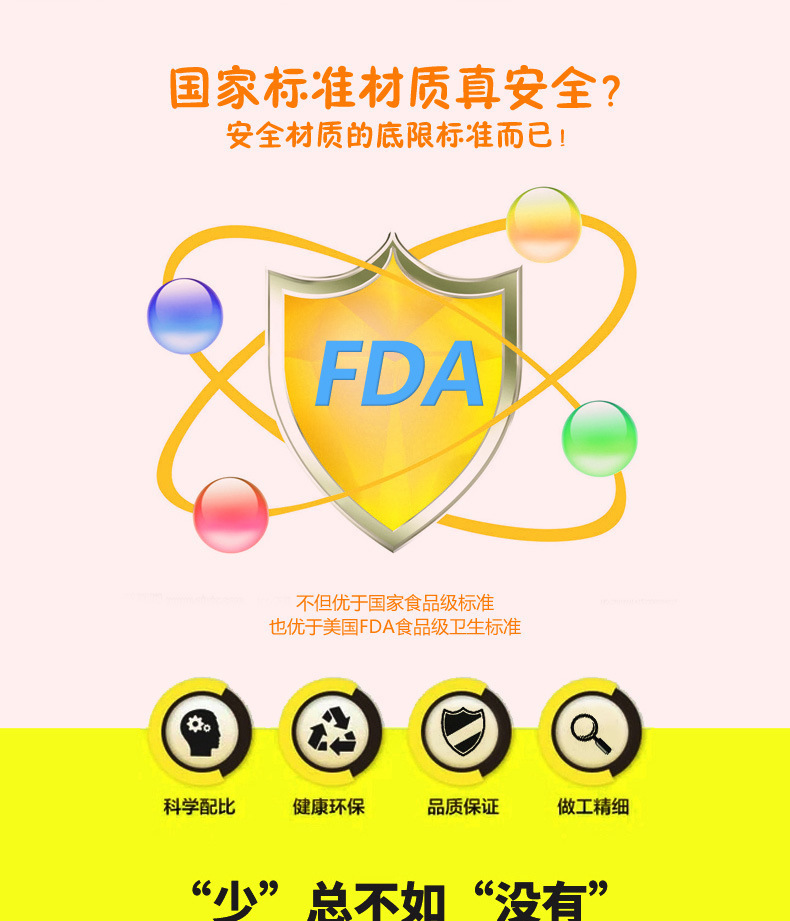 2、通过国家有害物质权威检测,不含有毒物质双酚A,高强度、高韧性、优异的抗冲击性能,时刻保护宝宝娇嫩的肌肤,温柔细腻的色彩。