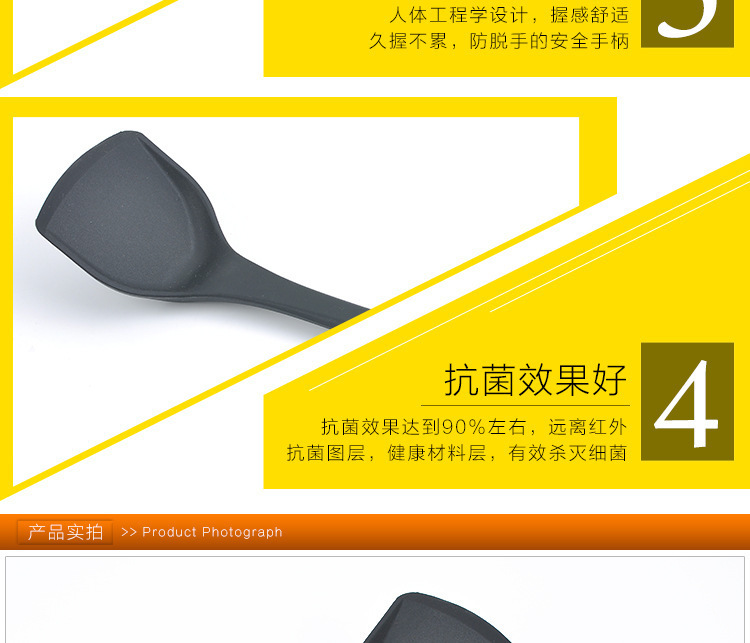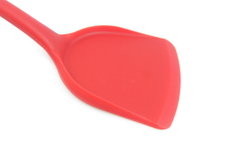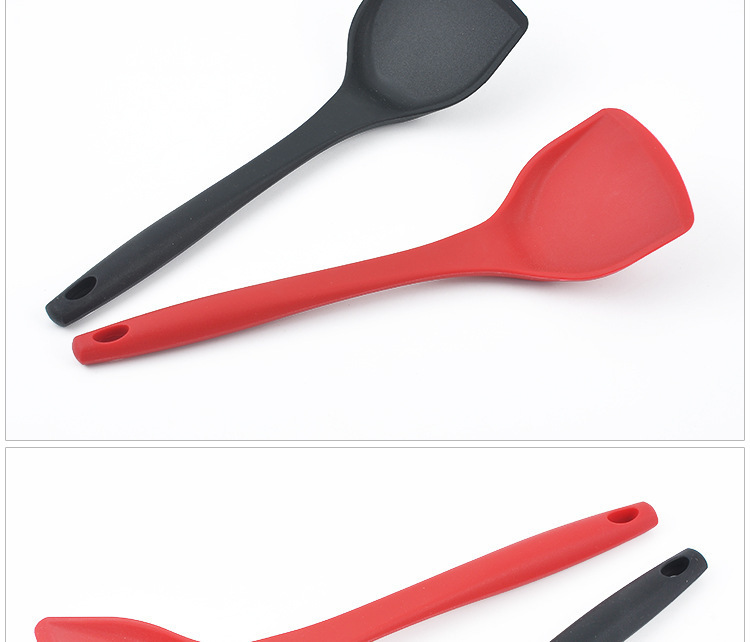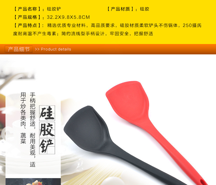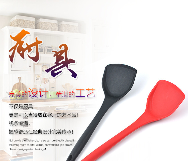 1、精选优质专业材料,高品质要求,硅胶材质柔软铲头不伤锅体,250℃耐高温不产生毒素,简约流线型手柄设计,牢固安全,把握舒适