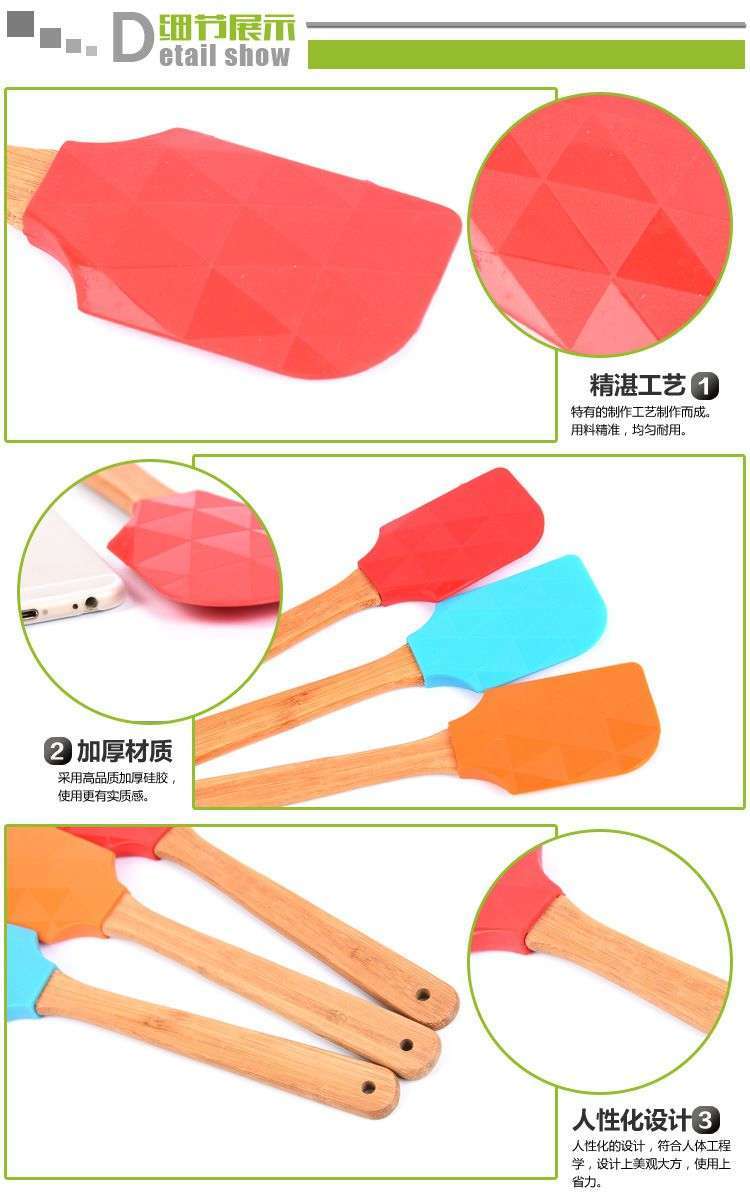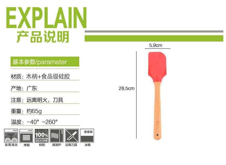 • 木柄硅胶刮刀-烘焙木柄硅胶刮刀定制厂家-东莞木柄硅胶刮刀工厂批发价格,产品类别:木柄硅胶刮刀材质:食品级硅胶+木柄价格段:10元以下产地:广东东莞是否可加印logo:可以产品上市时间:2019年尺寸长度(长X宽X厚):28.5CM重量(g):65G可售颜色分别是:红、橙、蓝、绿、玫红